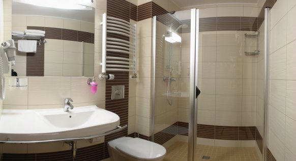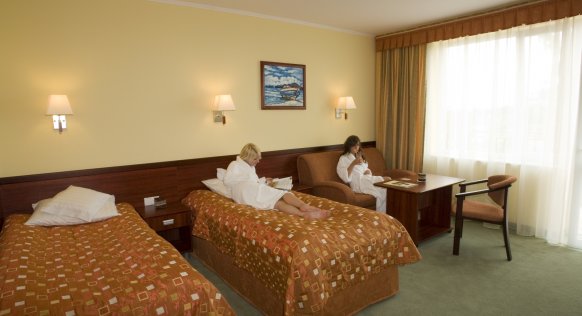 Das Hotel besitzt ein klimatisiertes Café mit Bar, ein Restaurant, ein Wellness und SPA-Bereich mit Gesichts- und Körperbehandlungen, Schwimmbad-Komplex mit Whirlpools, Dampfbad und eine finnische Sauna. Jod-Salzgrotte, Friseursalon, Solarium, Lift (teilweise), Konferenzräume, 24-Stunden-Rezeption, Waschsalon/Wäscheservice, ein Nacht-Club mit Bowlingbahn und Billard, bewachter Parkplatz (ca. 5-7 €/Tag), Spielplatz, Fahrradverleih, Nordic Walking-Stöcke Verleih, ein Kinderspielraum mit: Kletterwald, Spielbecken mit Bällen, Rutschbahnen, Kletterwand und XBOX Spiele. Freizeitangebot : Musikabend, Tischtennis, Bingoabend, Filmabend, Bowlingturnier. Kleine Haustiere sind nach Voranmeldung erlaubt (ca. 20 €/Nacht).