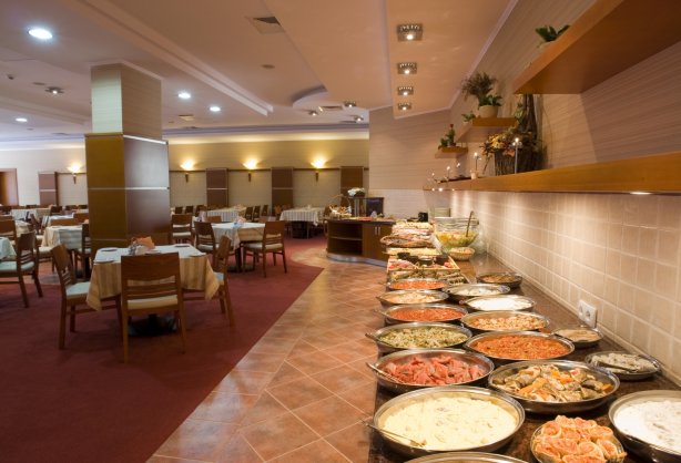 Das Hotel stellt einen geräumigen Speisesaal zur Verfügung, in dem bis zu 220 Gäste Platz finden. Halbpension oder Vollpension möglich. Die landestypischen und internationalen Gerichte werden in Buffetform serviert. Diabetiker-, Diät- und vegetarische Kost sind auf Anfrage und gegen Aufpreis möglich. Wichtig: zwischen 22.06.-24.08. wird nur Halbpension angeboten.