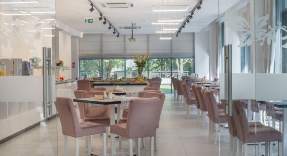 Zu den Einrichtungen und Dienstleistungen gehören Rezeption, Lobby-Bar, Lift, Café, Speisesaal, WLAN-Internetzugang, Hallenbad (12 x 5 m, 29-30 °C), Kinderbecken, Whirlpool, Sauna, Dampfbad, Fitnessraum, Spielplatz, Tiefgarage und Parkplätze.
