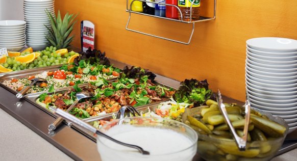 Im hauseigenen Speisesaal werden Halbpension und Vollpension angeboten. Alle Mahlzeiten erfolgen in Buffetform.