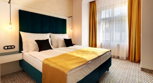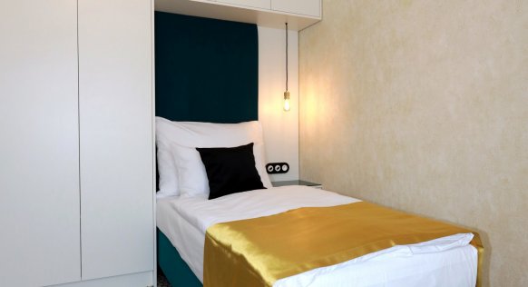 - Doppelzimmer (15 m²): ein standardmäßig ausgestattetes Doppelzimmer, das Badezimmer mit Badewanne oder Duschkabine/WC.