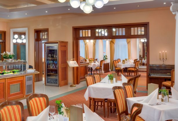 Böhmische und internationale Küche, Diätverpflegung möglich, Danubius Healthy Choice. Frühstück, Mittagessen und Abendessen in Buffetform, Salatbuffet. Verpflegung im Restaurant Goethe im Hotel Centrální Lázně.