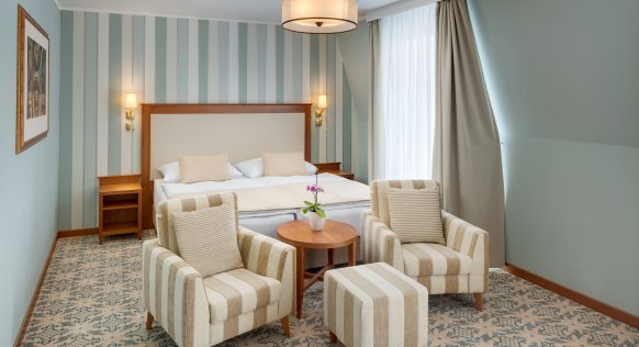 20 Zimmer der Kategorie Maria Superior, Maria Superior de luxe und Maria JuniorSuite de luxe. Alle Zimmer sind auf modernste Weise ausgestattet mit: iPod- / iPhone-Docking Station, High-Speed-Internet (WLAN), Bad, Kosmetikspiegel, Bidet, Haartrockner, Bademantel, Frotteepantoffeln, Schreibtisch, Minibar, Flachbild-Sat-TV, Radiowecker, Telefon mit Direktdurchwahl, Safe für das Notebook, Bügelbrett mit Bügeleisen, Minibar,Tee-und Kaffee-Wasserkocher-Set. Die meisten Zimmer mit Terrasse oder Balkon, mit einem Blick auf die Kolonnade oder auf den Park. In einigen Zimmern is teine Klimaanlage vorhanden (Vorreservierung erforderlich).
